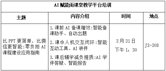 为助力老师们在课程教学全闭环中,顺利借助信息化教学平台进行课程资源建设与混合式教学,高效运用AI技术赋能教学实践,熟练掌握AI课程教学设计与应用技能,学院邀请学堂在线进校开展雨课堂AI版赋能未来课堂建设专题培训,通知如下: